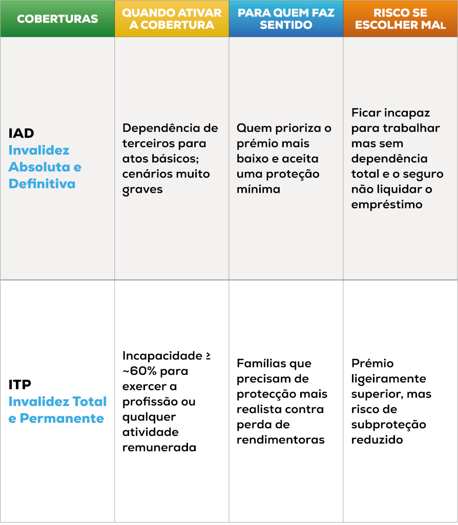 - ITP aciona com incapacidade relevante (tipicamente a partir de 60%), protegendo perda de rendimento e o equilíbrio familiar. Para a maioria das famílias, ITP é a escolha mais prudente.