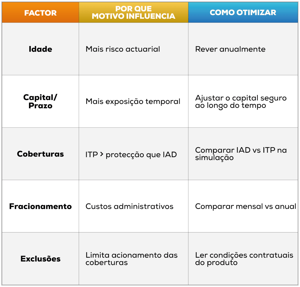 O prémio resulta da combinação de perfil (idade, profissão, histórico clínico), empréstimo (capital e prazo) e coberturas (IAD vs ITP).